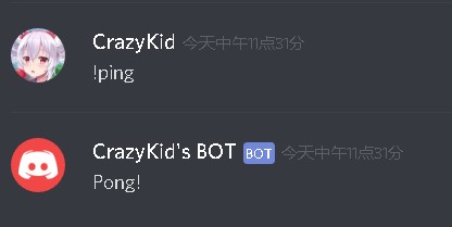 然后试试在频道里发 !ping,看看 BOT 会不会做出回复。