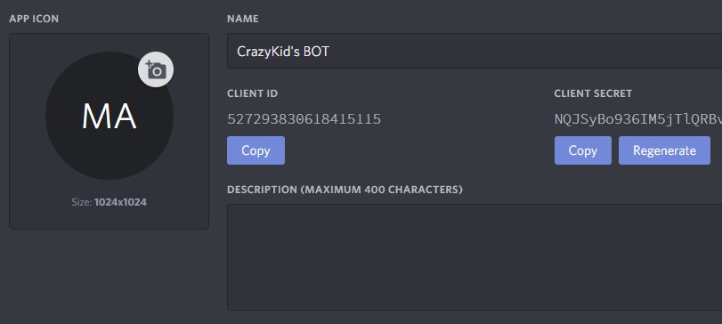ICON:应用头像,可上传可不上传,别人邀请 BOT 进入频道时可以看见,注意这个不是 BOT 的头像 NAME:应用名称,也是 BOT 的默认名字,但是 BOT 名字后期可更改 CLIENT ID:BOT 的客户端 ID,后面邀请机器人进频道时会用得上 CLIENT SECRET:应用秘钥,不可外泄。如果泄露,可以点 Regenerate 生成一个新的,旧的会作废。 DESCRIPTION:应用介绍,随便写