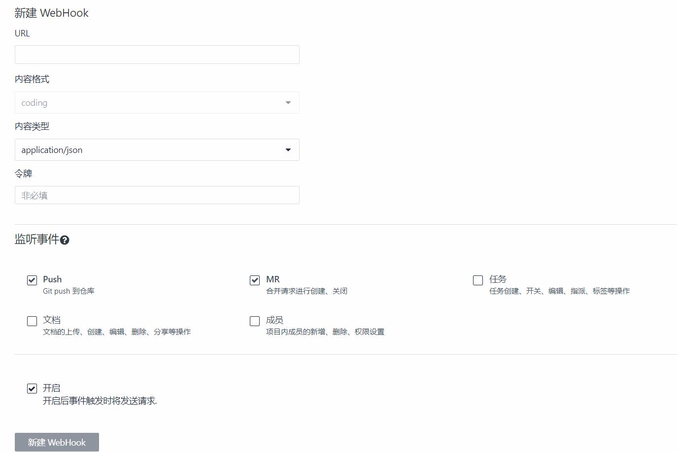 URL: WebHook访问的地址 内容类型: 选application/json 监听事件: 根据需要勾选